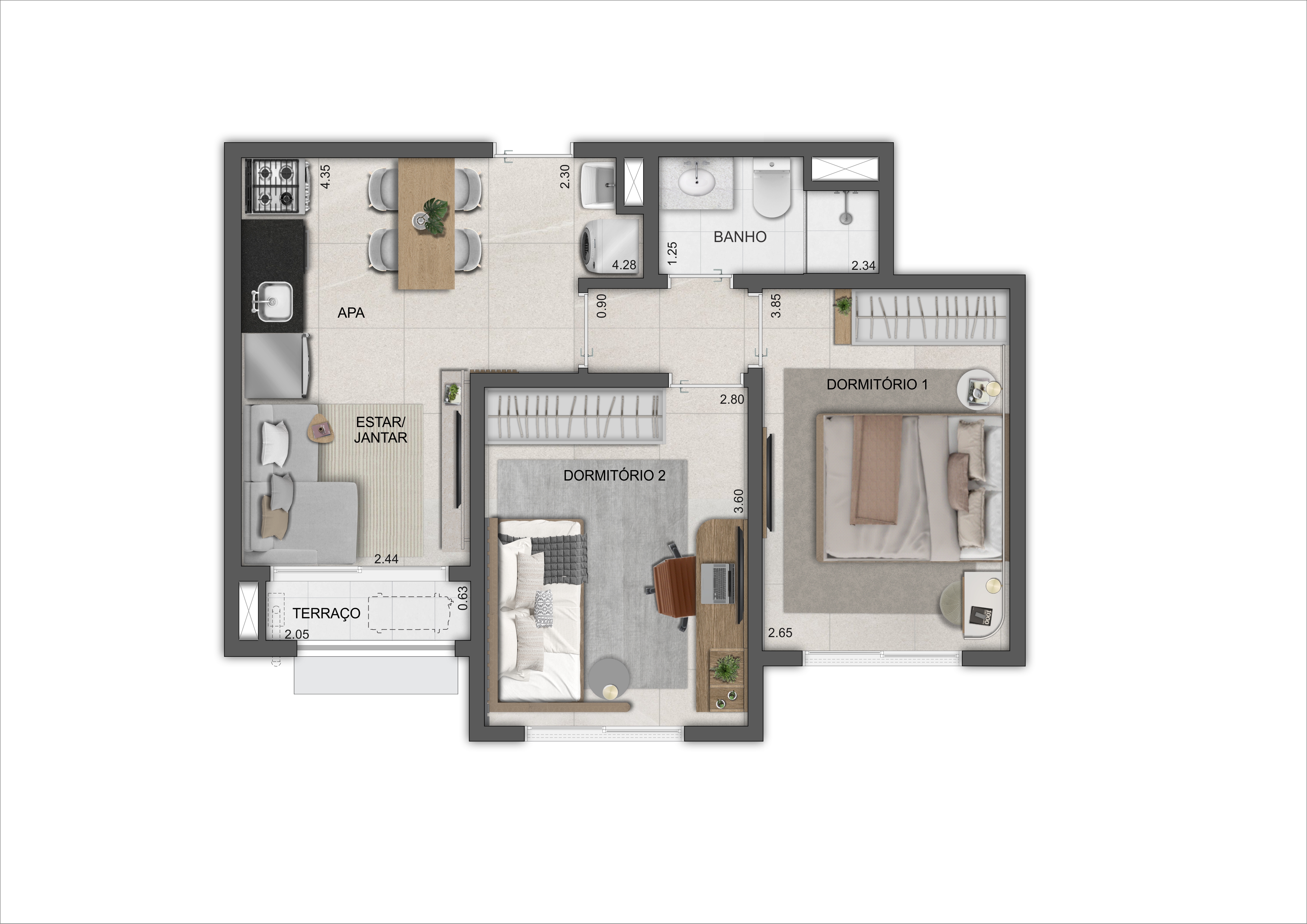 47m² - 2 dormitórios - 1 vaga